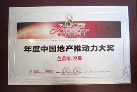 2011年1月9日,由全國工商聯房地產商會與《安家》雜志社聯合主辦的地產界盛典——第八屆“地產年度風云榜”評選在北京人民大會堂舉行隆重的頒獎儀式。奧特萊斯投資管理有限公司獲得“區域經濟推動力功勛企業”大獎,芭蕾雨•悅都項目憑借產品創新優勢以及開盤當日售罄的突出業績,榮獲“年度中國地產推動力大獎”。