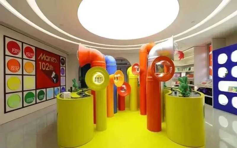Mamǎfufú將“小紅閑”這一概念發揮得淋漓盡致,無論是整體的場景風格,對于色彩的靈活運用,還是互動體驗的內容和品牌首店引入,都創造了極高的出片效果,吸引眾多年輕人前來打卡消費。Mamǎfufú超級百貨是一個跨界聯合的潮流文創空間,占據了M+馬利位置最好的沿街二樓,無論室外的墻體,還是室內的布置,均大面積運用了極具張力的紅黃藍三原色,將“馬利”這個百年顏料品牌的“色彩主義”貫穿于整體空間設計中。1000㎡的空間內營造了8個主題區域,設置馬利趣味工廠、馬利畫材、POP-UP Market、色彩理想國、靈感書集、色彩生活集市、色彩沙龍等主題區域,涵蓋藝術展覽、手工工作室、畫材、圖書、生活家居、藝術衍生、服裝零售等多種業態內容。
